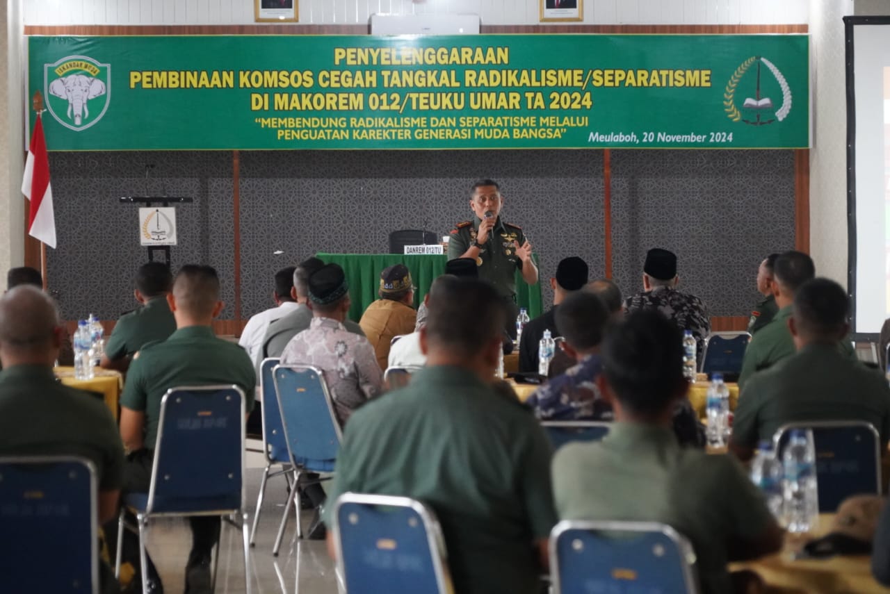 Meulaboh – Korem 012/Teuku Umar menggelar Komunikasi Sosial (Komsos) bertema “Membendung Radikalisme dan Separatisme Melalui Penguatan Karakter Generasi Muda Bangsa” di Aula Bhakti Gara Makorem, Rabu (20/11/2024). Kegiatan ini bertujuan mempererat silaturahmi antara masyarakat dengan TNI AD, khususnya Korem 012/TU, sekaligus mendukung tugas pokok sebagai Satuan Komando Kewilayahan (Satkowil).
