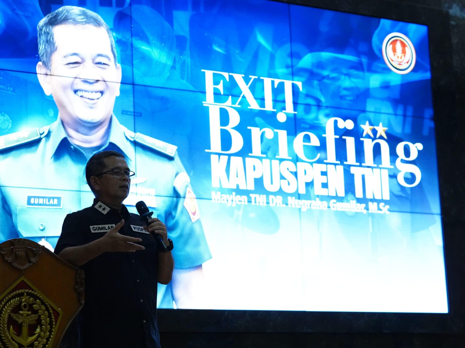 Kepala Pusat Penerangan Tentara Nasional Indonesia (Kapuspen TNI) Mayjen TNI Dr. Nugraha Gumilar, M.Sc., melaksanakan exit briefing kepada seluruh personel Puspen TNI, bertempat di Aula Balai Wartawan Puspen TNI, Mabes TNI Cilangkap, Jakarta Timur, Kamis (8/8/2024).