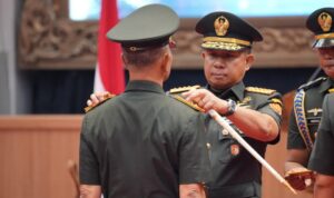 JAKARTA, Kepala Staf Angkatan Darat (Kasad) Jenderal TNI Andika Perkasa memimpin Serah Terima Jabatan (Sertijab) Asisten Logistik (Aslog) Kasad dari Mayjen TNI Jani Iswanto kepada Brigjen TNI Saiful Rachiman, di Lobi Gedung E Markas Besar Angkatan Darat (Mabesad), Jakarta, Selasa, (12/10/2021).
