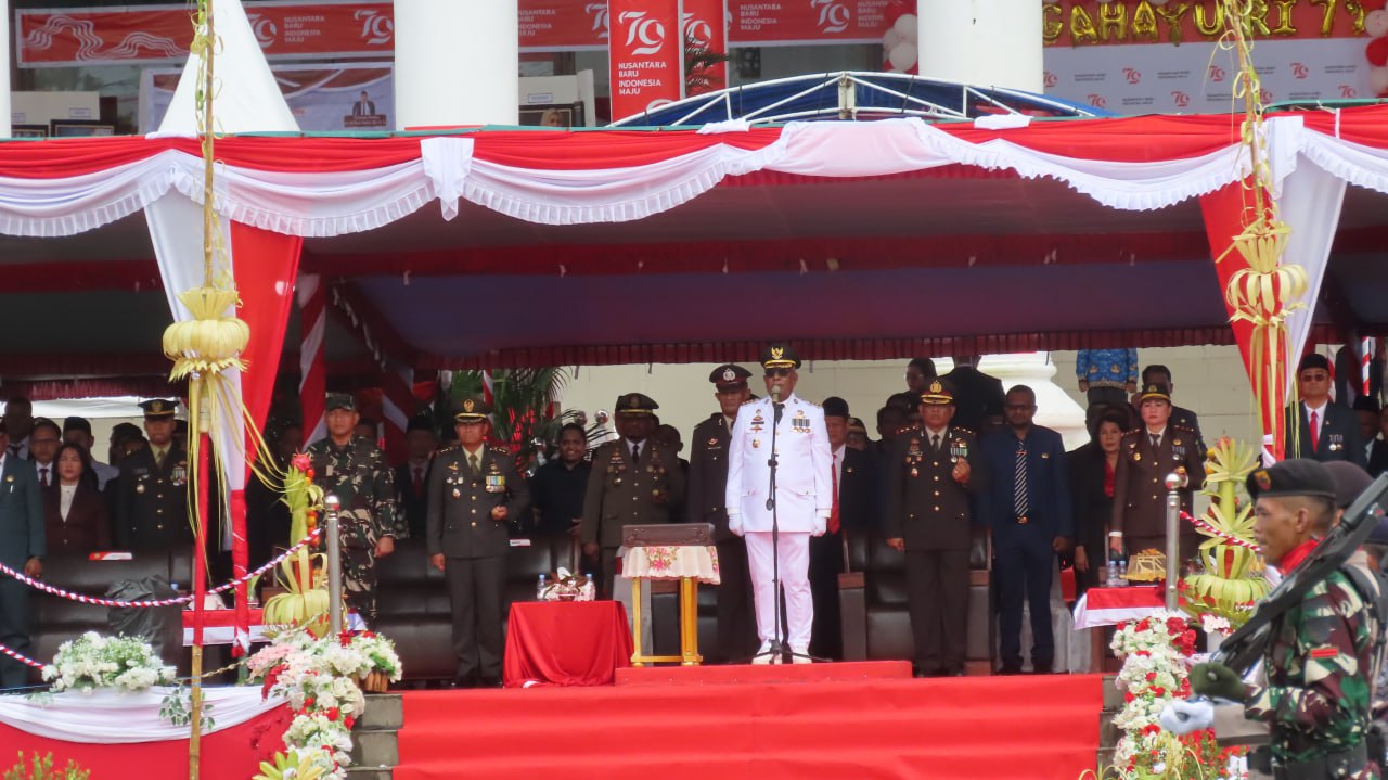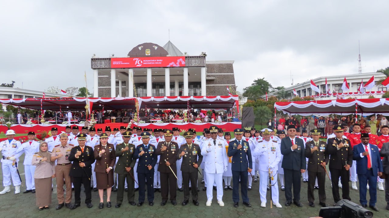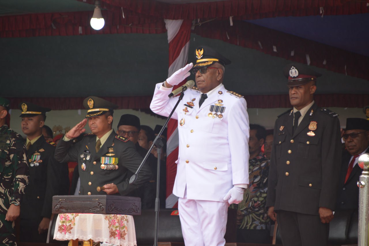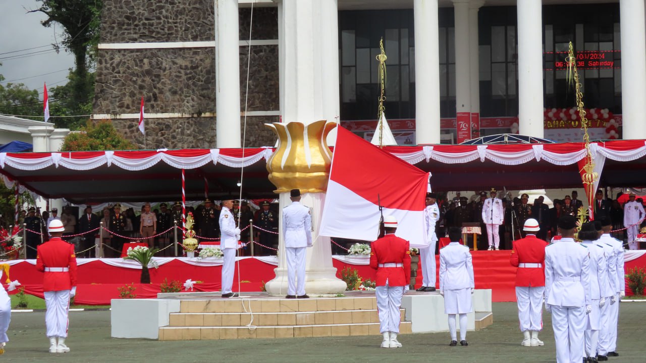 Timika – Komandan Kodim 1710/Mimika, Letkol Inf Dedy Cahyadi melaksanakan upacara peringatan HUT ke-79 Republik Indonesia di Kantor Pusat Pemerintahan Kabupaten Mimika, Distrik Kuala Kencana, Sabtu (17/08/2024). Bupati Mimika, Bapak Johanes Rettob, S.Sos., M.M. hadir sebagai Inspektur Upacara sedangkan Komandan Upacara dijabat oleh Danpomal Lanal Timika, Kapten Laut (PM) Samsul Hadi dan Perwira Upacara dijabat oleh Paset Lanal Timika, Letda Laut (H) Haris Sukuco.
