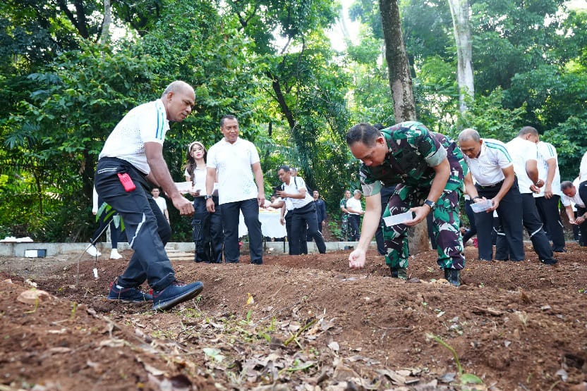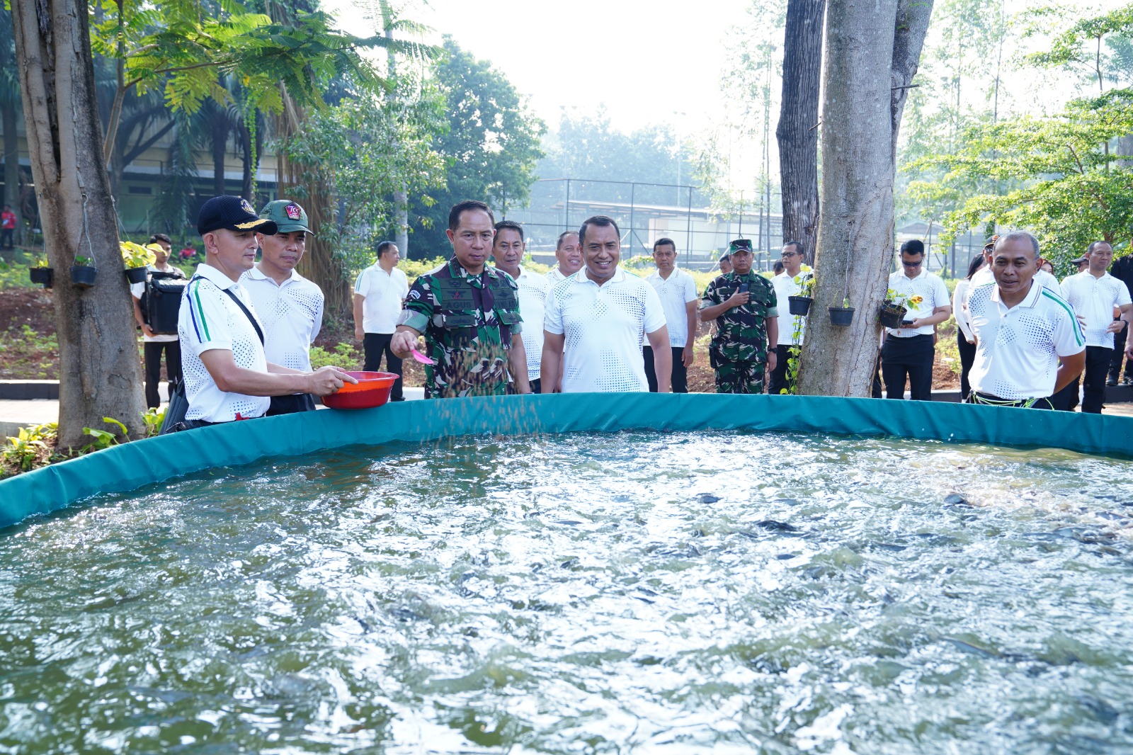Untuk menjaga kelestarian lingkungan dan menjaga ekosistem di area Mabes TNI, Panglima TNI Jenderal TNI Agus Subiyanto bersama satuan jajaran di lingkungan Mabes TNI melaksanakan kegiatan jalan santai, menanam pohon serta menebar benih ikan di sekitar Danau Tirta Asri, Mabes TNI, Cilangkap, Jakarta Timur, Jumat (8/11/2024).
