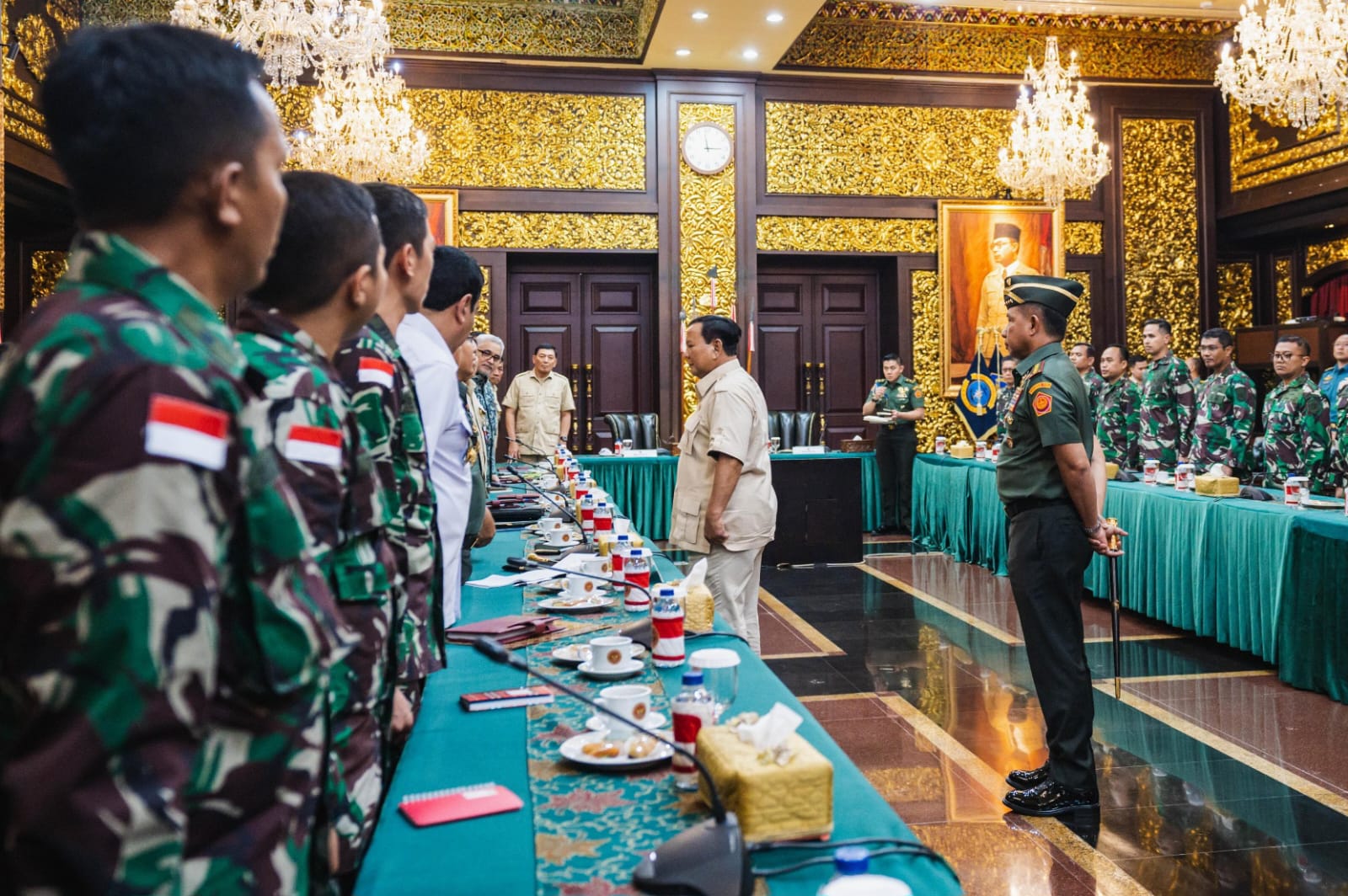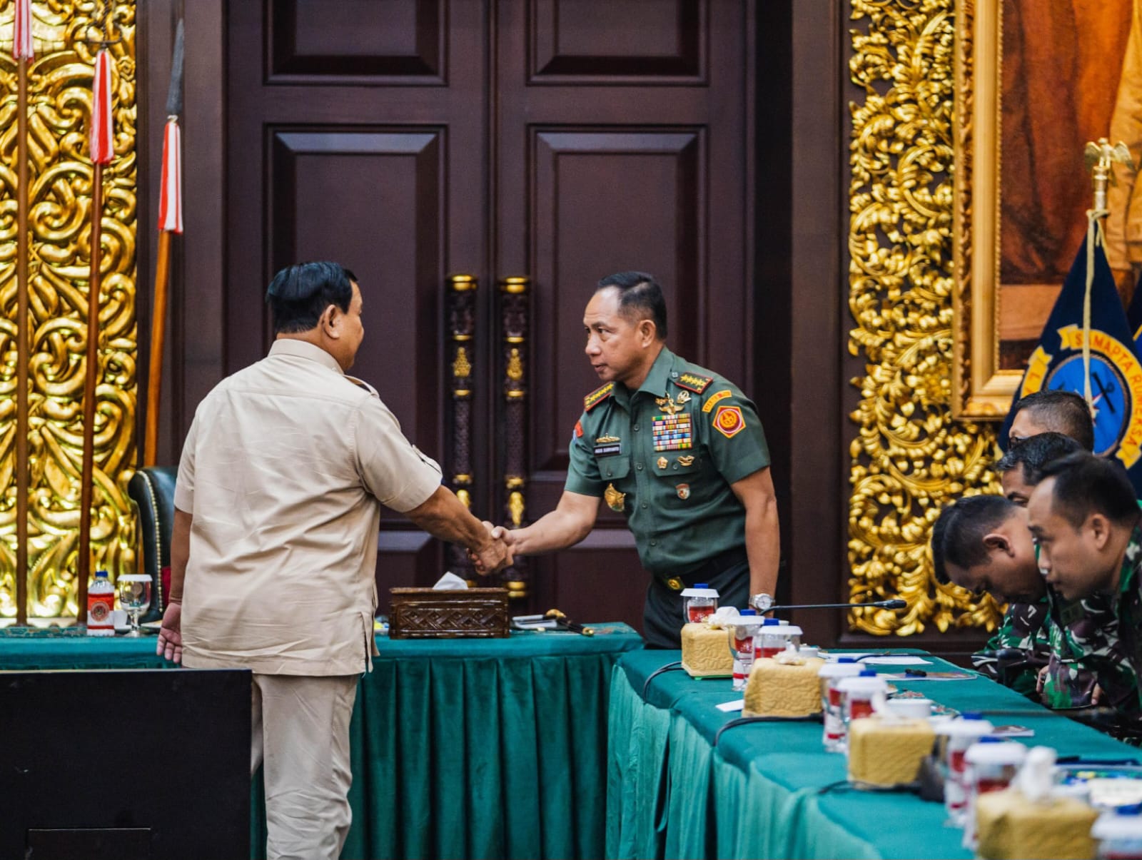 Panglima TNI Jenderal TNI Agus Subiyanto mendampingi Menteri Pertahanan RI Prabowo Subianto memberikan pembekalan kepada 40 personel tenaga kesehatan (Nakes) TNI yang akan menjalan misi kemanusiaan di Gaza, bertempat di Ruang Bhinneka Tunggal Ika (BTI), Kantor Kementerian Pertahanan RI, Jakarta Pusat, Rabu (7/8/2024).